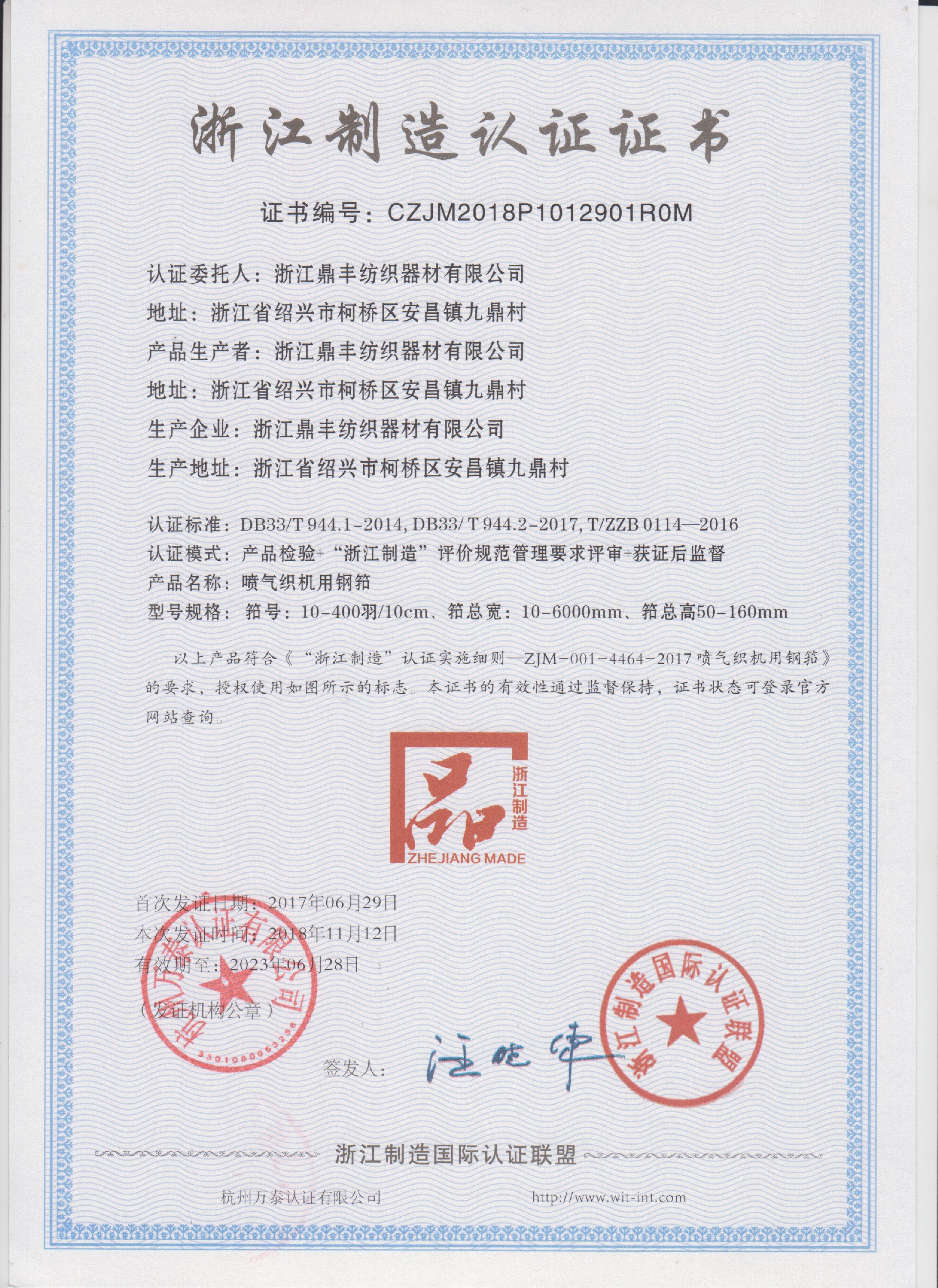公司現有固定資產6000余萬元,員工300余人,現具有年產噴氣異型筘12萬米,劍桿筘32萬米,噴水筘5萬米,綜框20萬片,鋼片綜2億片,停經片1.5億片, 織軸1.2萬套的生產能力。公司“越泉”商標被評為“中國馳名商標”。公司通過ISO9001 :2015國際質量體系認證,ISO14001:2015國際環(huán)境管理體系認證,ISO45001:2018國際職業(yè)健康安全管理體系認證,噴氣織機用鋼筘和織機用鋁合金綜框獲得“浙江制造”品牌認證,公司擁有自營進出口權,產品暢銷全國并遠銷印度、巴基斯坦、土耳其、埃及、哥倫比亞、意大利等國家和地區(qū)。